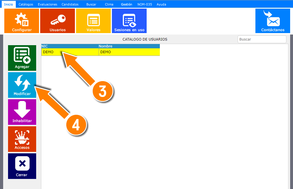 Si desea agregar a un nuevo evaluado a una orden de evaluación previamente creada para posteriormente poder comparar a los evaluados entre sí, siga los pasos siguientes: 1) Haga clic en el botón MODIFICAR , 2) Seleccione la orden a la cual desea agregar al evaluado, 3) La plataforma lo posicionará en el área para agregar los datos del nuevo candidato, ingrese estos datos, 4) Haga clic en AGREGAR CANDIDATO, 5) El nuevo evaluado ha sido agregado a la orden de evaluación.