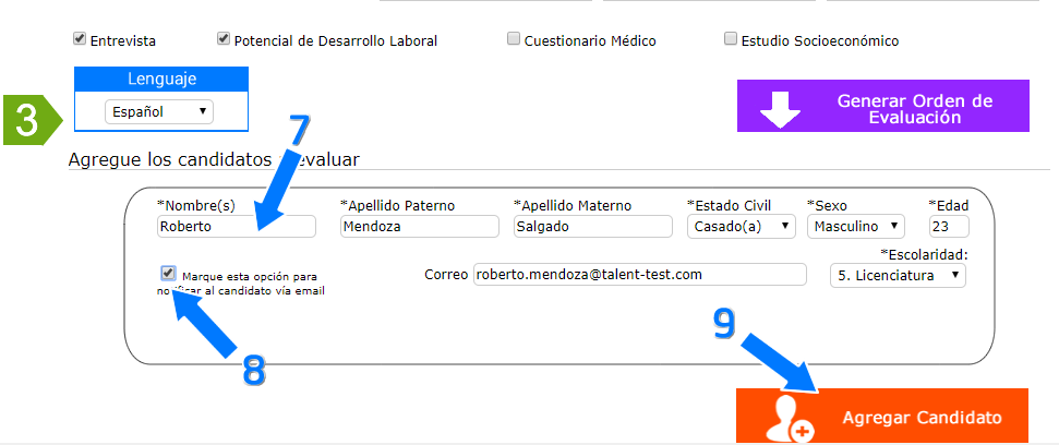 Para evaluar a un candidato es necesario crear una orden de evaluación, para ello siga los pasos siguientes: 1) Haga clic en el botón EVALUAR, 2) Seleccione con un clic el puesto a evaluar, 3) Marque lo que desea evaluar, dando un clic en el recuadro de cada elemento a evaluar, 4) Seleccione si desea que su evaluado conteste alguno de los formatos opcionales, 5) Haga clic en GENERAR ORDEN DE EVALUACION, 6) Si solo cuenta con el correo electrónico de su evaluado haga clic en el botón azul, de esta forma la plataforma le solicitará al evaluado dar de alta sus datos personales para aplicar sus pruebas, si usted cuenta con todos los datos personales de su evaluado haga clic en el botón naranja “AGREGAR DATOS DEL CANDIDATO” 7) Ingrese los datos personales de su evaluado incluyendo su correo electrónico, 8) Marque la opción “MARQUE ESTA OPCION PARA NOTIFICAR AL CANDIDATO VIA EMAIL, 9) Haga clic en el botón AGREGAR CANDIDATO, 10) La plataforma le enviará el correo a su evaluado para que este aplique sus pruebas, también puede copiar este enlace y enviarlo directamente a su evaluado a través de un correo electrónico personal. 11) Si este misma prueba será utilizada para evaluar a otros candidatos, utilice el botón “AGREGAR OTRO CANDIDATOA LA MISMA EVALUACIÓN” e ingrese los datos personales del otro candidato.