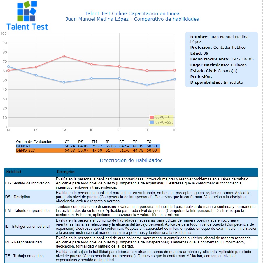 Este reporte muestra los resultados generales del evaluado, comparado los resultados esperados contra los resultados obtenidos, para consultarlo, siga estos pasos: 1) Haga clic en el botón RESULTADOS, 2) Haga clic en el recuadro del candidato evaluado, 3) Presione el botón REPORTE CANDIDATO VS PUESTO, 4) Seleccione el botón VISUALIZAR REPORTE COMPLETO, 5) Consulte el reporte generado.