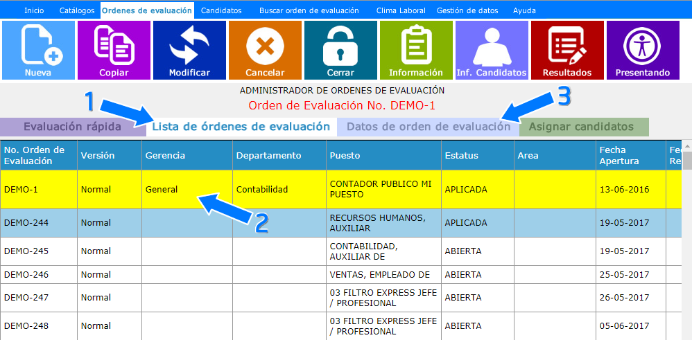 Si usted desea enriquecer la información dentro de las órdenes de evaluación puede hacerlo siguiendo estos pasos: 1) De clic en el pestaña amarilla LISTA DE ORDENES DE EVALUACION, 2) De clic en la orden deseada a la cual quiere enriquecer, se coloreará en amarillo, 3) Haga clic la pestaña DATOS DE ORDEN DE EVALUACION, 4) Ingrese la información que desee, 5) Haga clic GUARDAR.