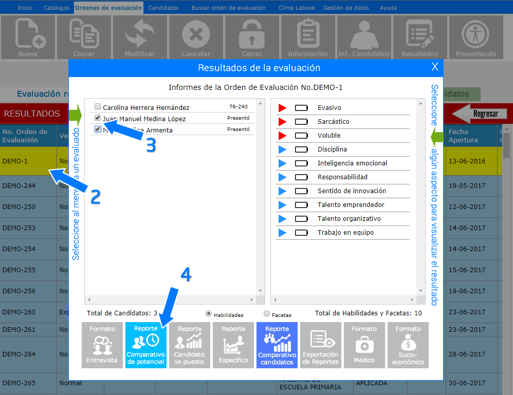 Este reporte muestra el comparativo entre dos o más evaluados (hasta 9) para consultarlo, siga estos pasos: 1) Haga clic en el botón RESULTADOS, 2) Seleccione la orden de evaluación que desea consultar, 3) Haga clic en dos o más recuadros de los evaluados que desea comparar, 4) Presione el botón REPORTE COMPARATIVO CANDIDATOS, 5) Seleccione el botón VISUALIZAR REPORTE COMPLETO, 6) Consulte el reporte generado.
